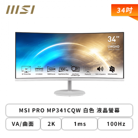 【34型】MSI PRO MP341CQW 白色 液晶螢幕 (DP/HDMI/VA/曲面/2K/1ms/100Hz/TÜV護眼認證/防閃爍/低藍光/內建喇叭/三年保固)