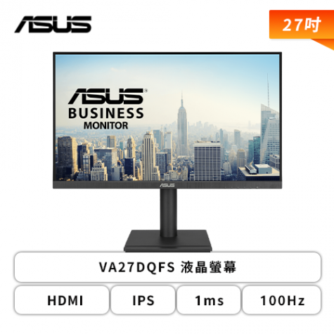 【27型】華碩 VA27DQFS 液晶螢幕 (DP/HDMI/D-SUB/IPS/1ms/100Hz/Adaptive-Sync/可升降/可旋轉/不閃屏/低藍光/內建喇叭/三年保固)
