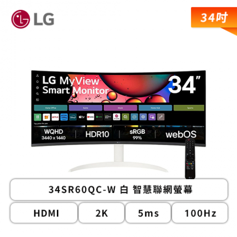 【34型】LG 34SR60QC-W 白 智慧聯網螢幕 (HDMI/Type-C/VA/曲面/2k/5ms/HDR10/搭載webOS 23/支援WiFi+藍芽/內建喇叭/三年保固)