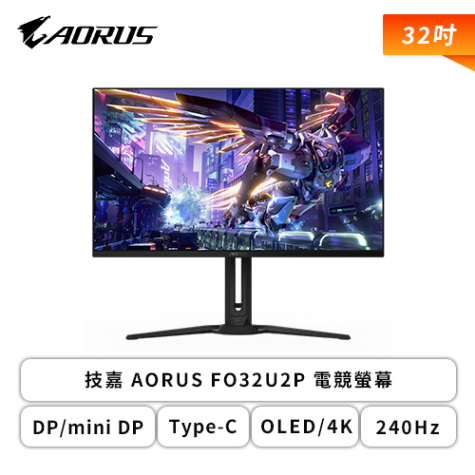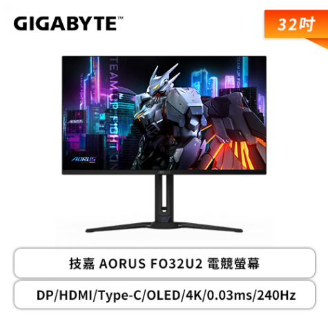 【32型】 AORUS FO32U2 QD-OLED 電競螢幕 (DP/HDMI/Type-C/QD-OLED/4K/0.03ms/240Hz/HDR400/99% DCI-P3/△E ≤ 2/FreeSync Premium Pro/KVM/黑平衡技術/萊因2.0認證/可升降/可旋轉/內建喇叭/登錄三年保固)