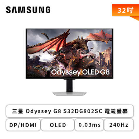 【32型】三星 Odyssey G8 S32DG802SC QD-OLED 電競螢幕 (DP/HDMI/QD-OLED/4K/0.03ms/240Hz/HDR10/FreeSync Premium Pro/抗眩光/可升降/可旋轉/內建喇叭/三年保固)