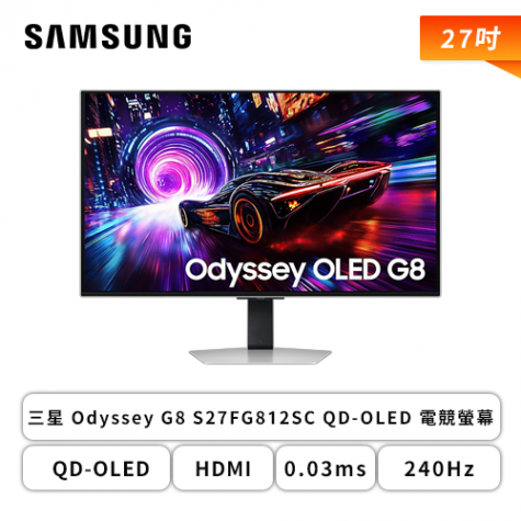 【27型】三星 Odyssey G8 S27FG812SC QD-OLED 電競螢幕 (DP/HDMI/USB/QD-OLED/4K/0.03ms/240Hz/HDR400/FreeSync Premium Pro/抗眩光真霧面面板/可升降/可旋轉/無喇叭/三年保固)