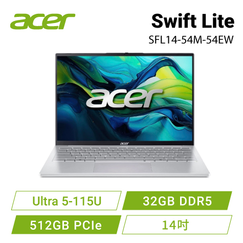 全新Core Ultra處理器,超輕999g acer Swift Lite SFL14-54M-54EW 銀 宏碁全新Core Ultra 時尚輕纖筆電/Ultra 5-115U/32GB DDR5/512GB PCIe/14吋/16:10 WUXGA 1920X1200/W11