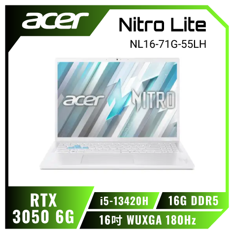 高效★可擴充 acer Nitro Lite NL16-71G-55LH 白 宏碁高效能筆電/i5-13420H/RTX3050 6G/16G DDR5/512G PCIe/16吋 WUXGA 180HZ/W11/包含包包及滑鼠/UN.D59TA.001