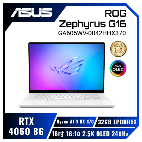 RTX4060滿血出擊 ASUS ROG Zephyrus G16 GA605WV-0042HHX370 鉑月銀 華碩西風之神輕薄電競AI筆電/Ryzen AI 9 HX 370/RTX4060 8G/32GB LPDDR5X/1TB PCIe/16吋 16:10 2.5K OLED 240Hz/W11/含ROG保護套+電競滑鼠【整新福利品】