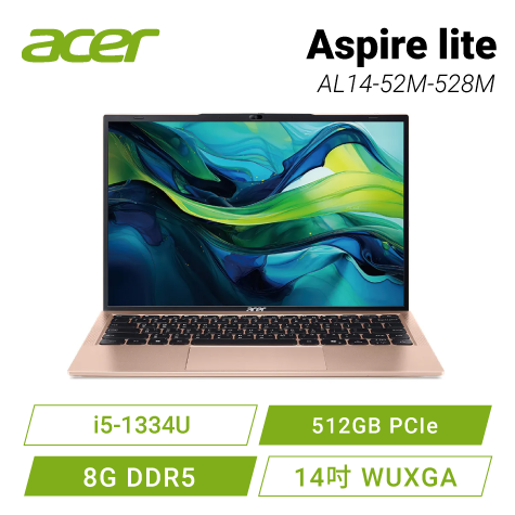輕薄高效★可擴充 【新品】acer lite AL14-52M-528M 金 宏碁高效能筆電/i5-1334U/8GB DDR5/512G PCIe/14吋 WUXGA 1920 x 1200/W11/不包含包包及滑鼠【福利品出清】