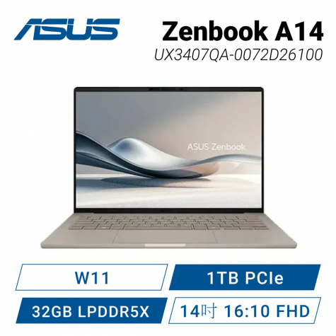 世界最輕899g起 ASUS Zenbook A14 UX3407QA-0072D26100 沙暮金 華碩AI時尚纖薄OLED筆電/Snapdragon X X1 26 100/32GB LPDDR5X/1TB PCIe/14吋 16:10 FHD+ OLED/W11/0.98Kg/含原廠保護袋