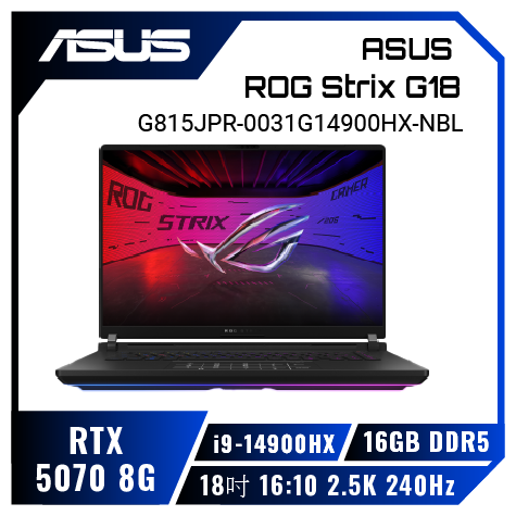 14代i9處理器★RTX5070 ASUS ROG Strix G18 G815JPR-0031G14900HX-NBL 電光綠 華碩旗艦滿血版電競筆電/i9-14900HX/RTX5070 8G/16GB DDR5/1TB PCIe/18吋 16:10 2.5K 240Hz/W11/含ROG後背包及電競滑鼠【整新福利品】