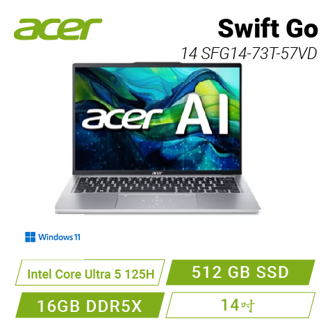 全新Core Ultra處理器 【原廠福利品】acer Swift Go SFG14-73T-57VD 星空銀 宏碁全新Core Ultra 時尚輕纖筆電/Ultra 5-125H/Intel ARC /16GB DDR5/512GB PCIe/14吋 16:10 WUXGA觸控/W11/含原廠包包及滑鼠