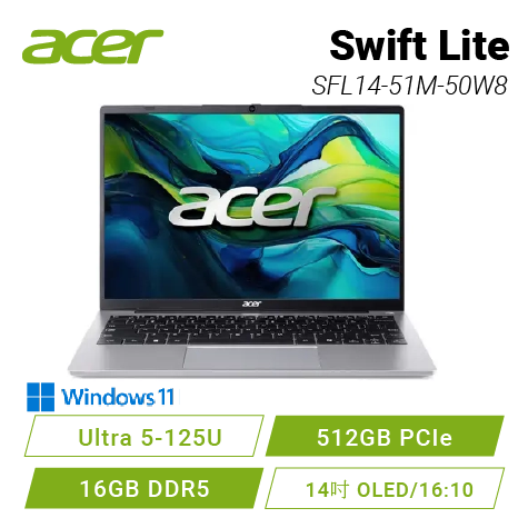 全新Core Ultra處理器 【原廠福利品】acer Swift Lite SFL14-51M-54Q6 銀 宏碁全新Core Ultra 時尚輕纖筆電/Ultra 5-115U/8GB+8GB DDR5/512GB PCIe/14吋 OLED/16:10 WUXGA 1920X1200/W11