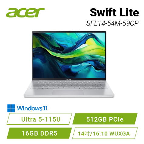 全新Core Ultra處理器,超輕999g 【原廠福利品】acer Swift Lite SFL14-54M-59CP 銀 宏碁全新Core Ultra 時尚輕纖筆電/Ultra 5-115U/16GB DDR5/512GB PCIe/14吋/16:10 WUXGA 1920X1200/W11