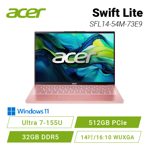 全新Core Ultra處理器,超輕999g 【原廠福利品】acer Swift Lite SFL14-54M-71C8晨曦粉 宏碁全新Core Ultra 時尚輕纖筆電/Ultra 7-155U/32GB DDR5/512GB PCIe/14吋/16:10 WUXGA 1920X1200/W11