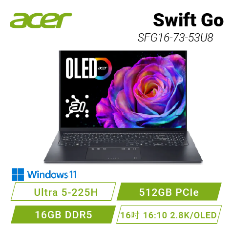 全新Core Ultra處理器 【原廠福利品】acer Swift Go SFG16-73-53U8 宏碁全新Core Ultra 時尚輕纖筆電 灰/Ultra 5-225H/Intel ARC/16GB DDR5/512GB PCIe/16吋 16:10 2.8K/OLED 鏡面/W11/含原廠包包及滑鼠/UN.JD5TA.002
