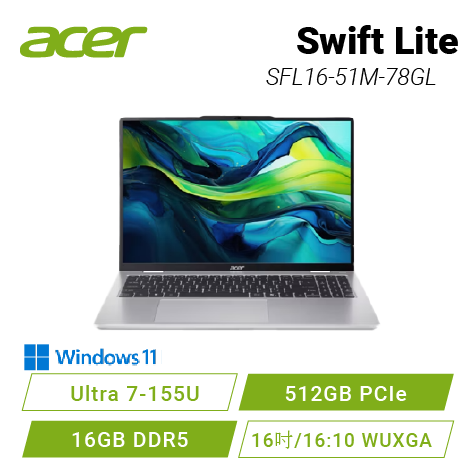 全新Core Ultra處理器 【原廠福利品】acer Swift Lite SFL16-51M-78GL 銀 宏碁全新Core Ultra 時尚輕纖筆電/Ultra 7-155U/16GB DDR5/512GB PCIe/16吋/16:10 WUXGA 1920X1200/W11
