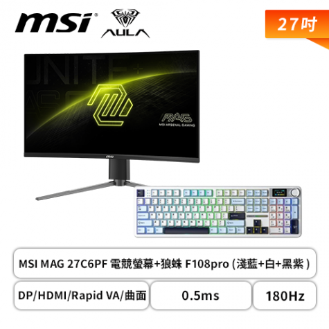 【破盤價】【27型】MSI MAG 27C6PF 電競螢幕 (DP/HDMI/Rapid VA/曲面/0.5ms/180Hz/Adaptive-Sync/HDR READY/AI VISION/可升降/無喇叭/三年保固)+ 狼蛛 AULA F108pro (淺藍+白+黑紫 )