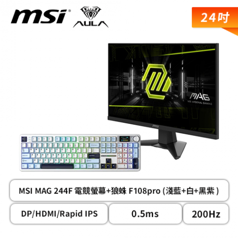【破盤價】【24型】MSI MAG 244F 電競螢幕 (DP/HDMI/Rapid IPS/0.5ms/200Hz/FreeSync Premium/HDR READY/AI VISION/無喇叭/三年保固)+ 狼蛛 AULA F108pro (淺藍+白+黑紫 )