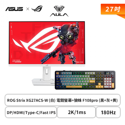 【破盤價】【27型】華碩 ROG Strix XG27ACS-W 白色 電競螢幕 (DP/HDMI/Type-C/Fast IPS/2K/1ms/180Hz/G-Sync/HDR400/可變超頻驅動 2.0/133% sRGB/可升降/可旋轉/無喇叭/三年保固)+狼蛛 AULA F108pro (黑+灰+黄)
