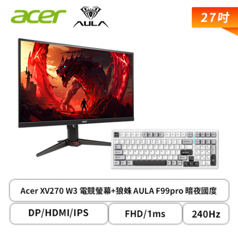 【破盤價】【27型】Acer XV270 W3 電競螢幕 (DP/HDMI/IPS/FHD/1ms/240Hz/FreeSync/可升降旋轉/三年保固)+狼蛛 AULA F99pro 暗夜國度(淺灰+白+深灰)