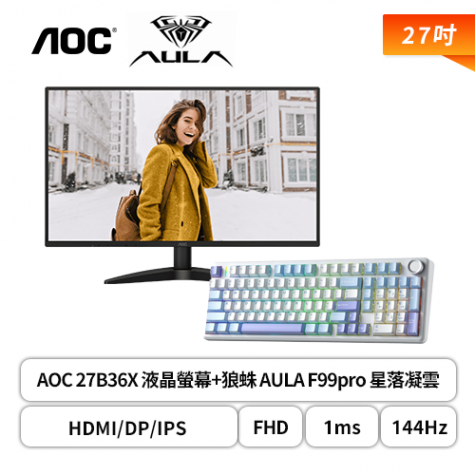 【破盤價】【27型】AOC 27B36X 液晶螢幕 (HDMI/DP/IPS/1ms/144Hz)+狼蛛 AULA F99pro 星落凝雲 (淺藍+白+深紫)