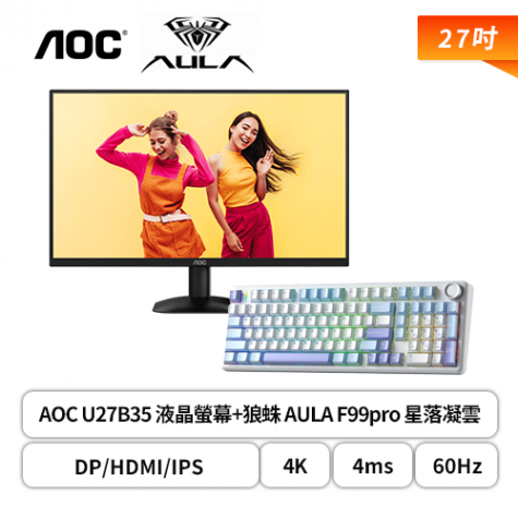 【破盤價】【27型】AOC U27B35 液晶螢幕 (DP/HDMI/IPS/4K/4ms/60Hz/Adaptive Sync/HDR10/sRGB 125%/Delta E < 2/不閃頻/低藍光/無喇叭/三年保固)+狼蛛 AULA F99pro 星落凝雲 (淺藍+白+深紫)