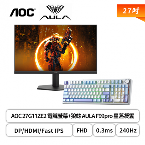 【破盤價】【27型】AOC 27G11ZE2 電競螢幕 (DP/HDMI/Fast IPS/0.3ms/240Hz/Adaptive Sync/HDR10/無喇叭/三年保固)+狼蛛 AULA F99pro 星落凝雲 (淺藍+白+深紫)