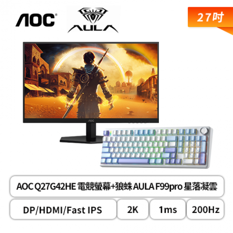 【破盤價】【27型】AOC Q27G42HE 電競螢幕 (DP/HDMI/Fast IPS/2K/1ms/200Hz/Adaptive Sync/HDR10/內建喇叭/三年保固+)狼蛛 AULA F99pro 星落凝雲 (淺藍+白+深紫)