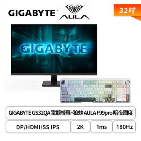 【破盤價】【32型】GIGABYTE GS32QA 電競螢幕 (DP/HDMI/SS IPS/2K/1ms/180Hz/HDR/FreeSync Premium/黑平衡技術/萊因認證/低藍光/不閃屏/無喇叭/三年保固)+狼蛛 AULA F99pro 暗夜國度 (淺灰+白+深灰)
