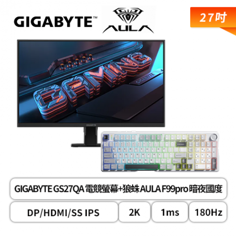 【破盤價】【27型】GIGABYTE GS27QA 電競螢幕 (DP/HDMI/SS IPS/2K/1ms/180Hz/HDR READY/FreeSync/黑平衡技術/萊因認證/低藍光/不閃屏/無喇叭/三年保固)+狼蛛 AULA F99pro 暗夜國度 (淺灰+白+深灰)