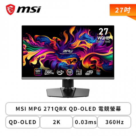 【27型】MSI MPG 271QRX QD-OLED 電競螢幕 (DP/HDMI/Type-C(90w)/QD-OLED/2K/0.03ms/360Hz/Adaptive Sync/HDR BLACK 400/可升降/可旋轉/無喇叭/三年保固)