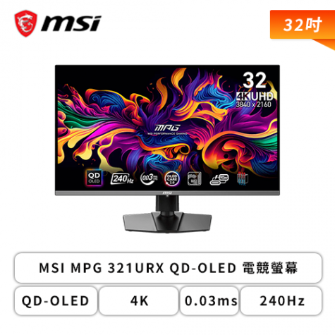 【32型】MSI MPG 321URX QD-OLED 電競螢幕 (DP/HDMI/Type-C(90w)/QD-OLED/4K/0.03ms/240Hz/FreeSync Premium Pro/HDR BLACK 400/無喇叭/三年保固)