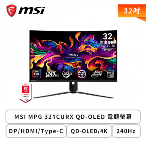 【32型】MSI MPG 321CURX QD-OLED 電競螢幕 (DP/HDMI/Type-C(98W)/QD-OLED/曲面/4K/0.03ms/240Hz/FreeSync Premium Pro/HDR BLACK 400/無喇叭/三年保固)