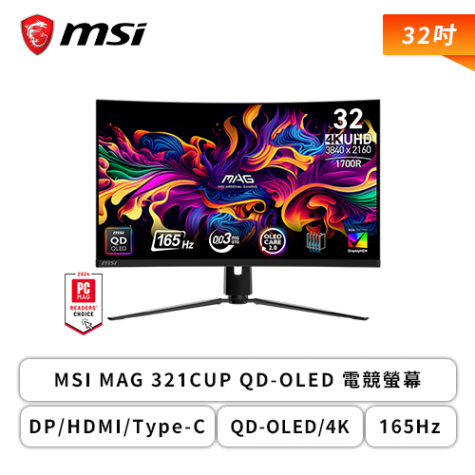 【32型】MSI MAG 321CUP QD-OLED 電競螢幕 (DP/HDMI/Type-C/QD-OLED/曲面/4K/0.03ms/165Hz/Adaptive-Sync/HDR BLACK 400/無喇叭/三年保固)