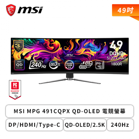 【49型】MSI MPG 491CQPX QD-OLED 電競螢幕 (DP/HDMI/Type-C(98w)/QD-OLED/曲面/2.5K/0.03ms/240Hz/Adaptive Sync/HDR BLACK 400/無喇叭/三年保固)