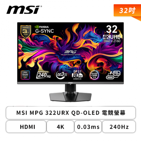 【32型】MSI MPG 322URX QD-OLED 電競螢幕 (DP 2.1 UHBR20/HDMI/Type-C(98w)/QD-OLED/4K/0.03ms/240Hz/FreeSync Premium Pro/HDR BLACK 400/KVM/可升降/無喇叭/三年保固)