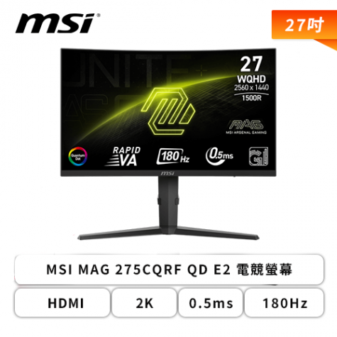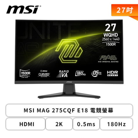 【27型】MSI MAG 275CQF E18 電競螢幕 (DP/HDMI/Rapid VA/曲面/2K/0.5ms/180Hz/Adaptive-Sync/HDR READY/AI VISION/無喇叭/三年保固)