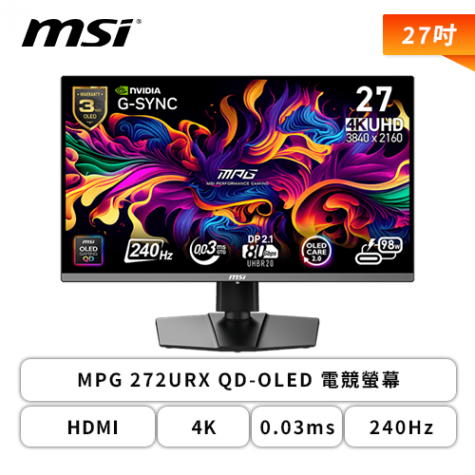 【27型】MSI MPG 272URX QD-OLED 電競螢幕 (DP2.1 UHBR20/HDMI/Type-C(98w)/QD-OLED/4K/0.03ms/240Hz/G-SYNC Compatible/HDR BLACK 400/AI VISION/KVM/可升降/可旋轉/無喇叭/三年保固)