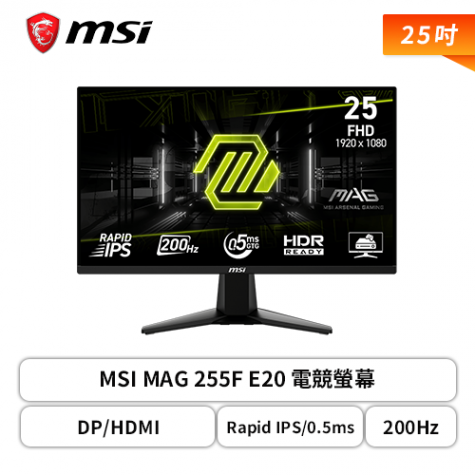 【25型】MSI MAG 255F E20 電競螢幕 (DP/HDMI/Rapid IPS/0.5ms/200Hz/FreeSync Premium/HDR READY/AI VISION/無喇叭/三年保固)