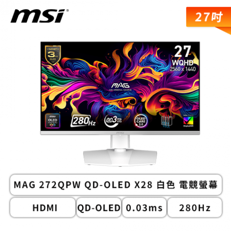 【27型】MSI MAG 272QPW QD-OLED X28 白色 電競螢幕 (DP/HDMI/Type-C/QD-OLED/2K/0.03ms/280Hz/Adaptive Sync/HDR BLACK 400/AI VISION/可升降/可旋轉/無喇叭/三年保固)