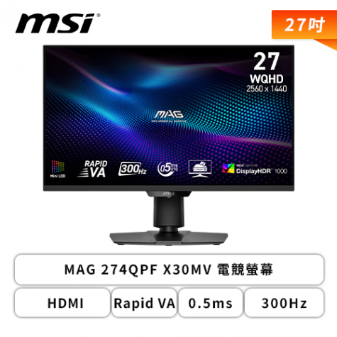 【27型】MSI MAG 274QPF X30MV 電競螢幕 (DP/HDMI/Rapid VA/Mini-LED/2K/0.5ms/300Hz/Adaptive-Sync/HDR 1000/AI VISION/量子點/可升降/可旋轉/無喇叭/三年保固)