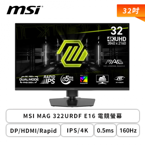 【32型】MSI MAG 322URDF E16 電競螢幕 (DP/HDMI/Rapid IPS/4K/0.5ms/160Hz(FHD 320Hz)/Adaptive-Sync/HDR BLACK 400/AI Vison/可升降/無喇叭/三年保固)