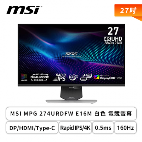 【27型】MSI MPG 274URDFW E16M 白色 電競螢幕 (DP/HDMI/Type-C(98W)/Rapid IPS/Mini-LED/4K/0.5ms/160Hz(FHD320Hz)/Adaptive-Sync/HDR 1000/AI VISION/量子點/可升降/可旋轉/無喇叭/三年保固)