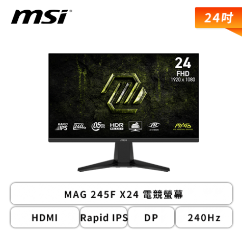 【24型】MSI MAG 245F X24 電競螢幕 (DP/HDMI/FHD/Rapid IPS/240Hz/FreeSync Premium/HDR READY/無喇叭/三年保固)