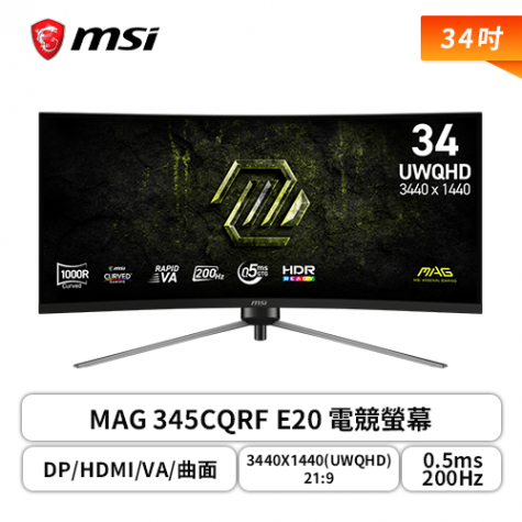 【34型】MSI MAG 345CQRF E20 電競螢幕 (DP/HDMI/VA/曲面/3440X1440 (UWQHD)/21:9/0.5ms/200Hz/Adaptive-Sync/HDR READY/無喇叭/三年保固)