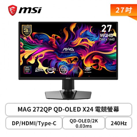 【27型】MSI MAG 272QP QD-OLED X24 電競螢幕 (DP/HDMI/Type-C/QD-OLED/2K/0.03ms/240Hz/無喇叭/三年保固)