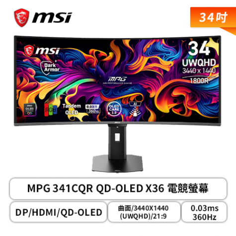 【34型】MSI MPG 341CQR QD-OLED X36 電競螢幕 (DP/HDMI/QD-OLED/曲面/3440X1440 (UWQHD)/21:9/0.03ms/360Hz/AMD FreeSync/HDR/無喇叭/三年保固)