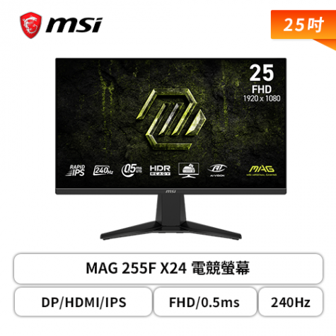 【25型】MSI MAG 255F X24 電競螢幕 (DP/HDMI/IPS/FHD/0.5ms/240Hz/無喇叭/三年保固)