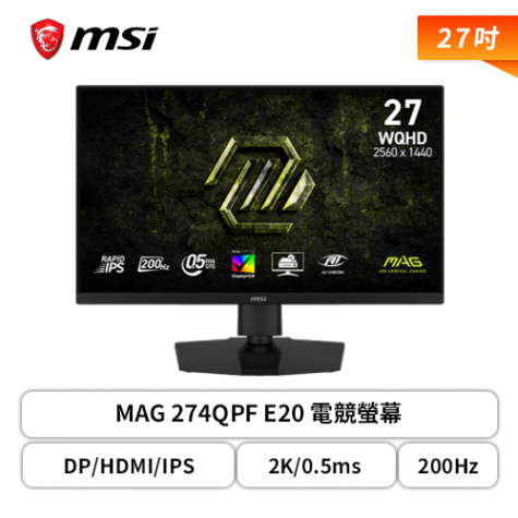 【27型】MSI MAG 274QPF E20 電競螢幕 (DP/HDMI/IPS/2K/0.5ms/Adaptive-Sync/HDR 400/200Hz/無喇叭/三年保固)