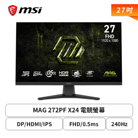 【27型】MSI MAG 272PF X24 電競螢幕 (DP/HDMI/IPS/FHD/0.5ms/Adaptive-Sync/HDR Ready /240Hz/內建喇叭/升降腳/三年保固)