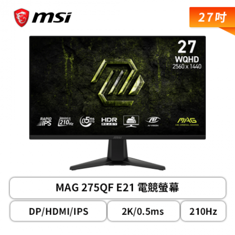【27型】MSI MAG 275QF E21 電競螢幕 (DP/HDMI/IPS/2K/0.5ms/Adaptive-Sync/HDR400 /210Hz/無喇叭/三年保固)