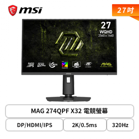 【27型】MSI MAG 274QPF X32 電競螢幕 (DP/HDMI/IPS/2K/0.5ms/Adaptive-Sync/HDR400 /320Hz/無喇叭/三年保固)
